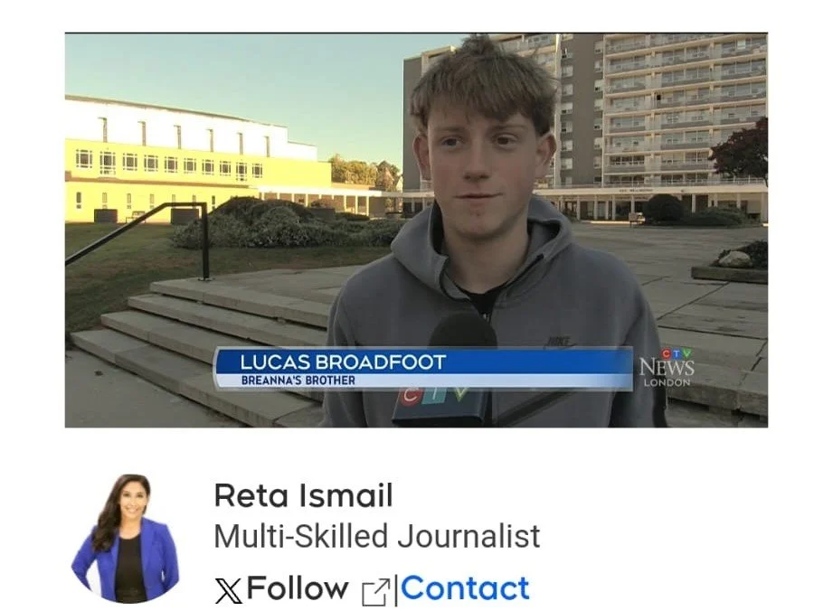 Voices Against Violence member Lucas Broadfoot, whose sister Breanna was a victim of femicide this past summer, will be speaking at the London, ON rally at London City Hall Oct 21. Source: Reta Ismail, CTV News London.
